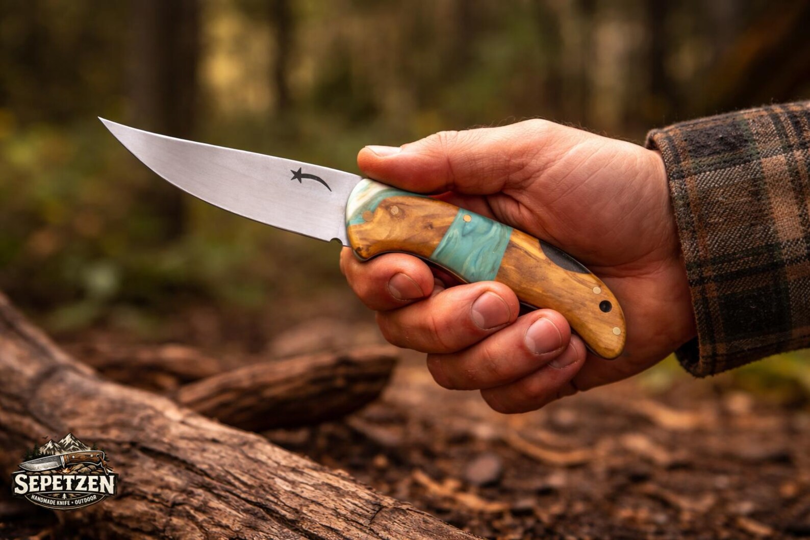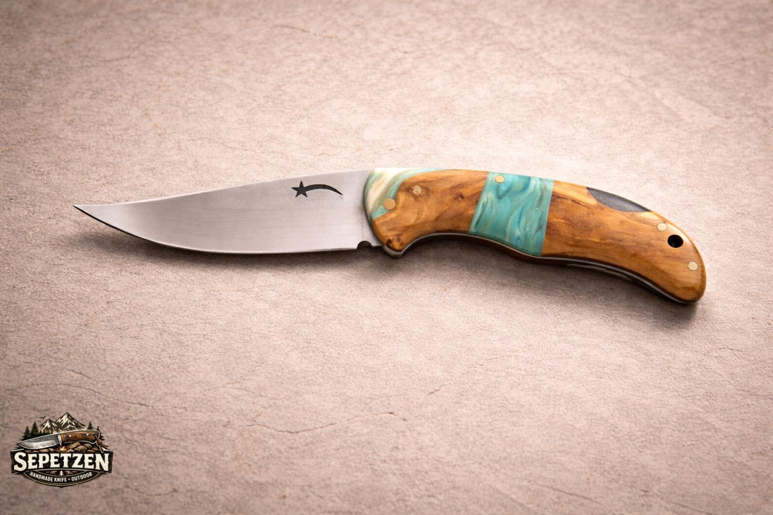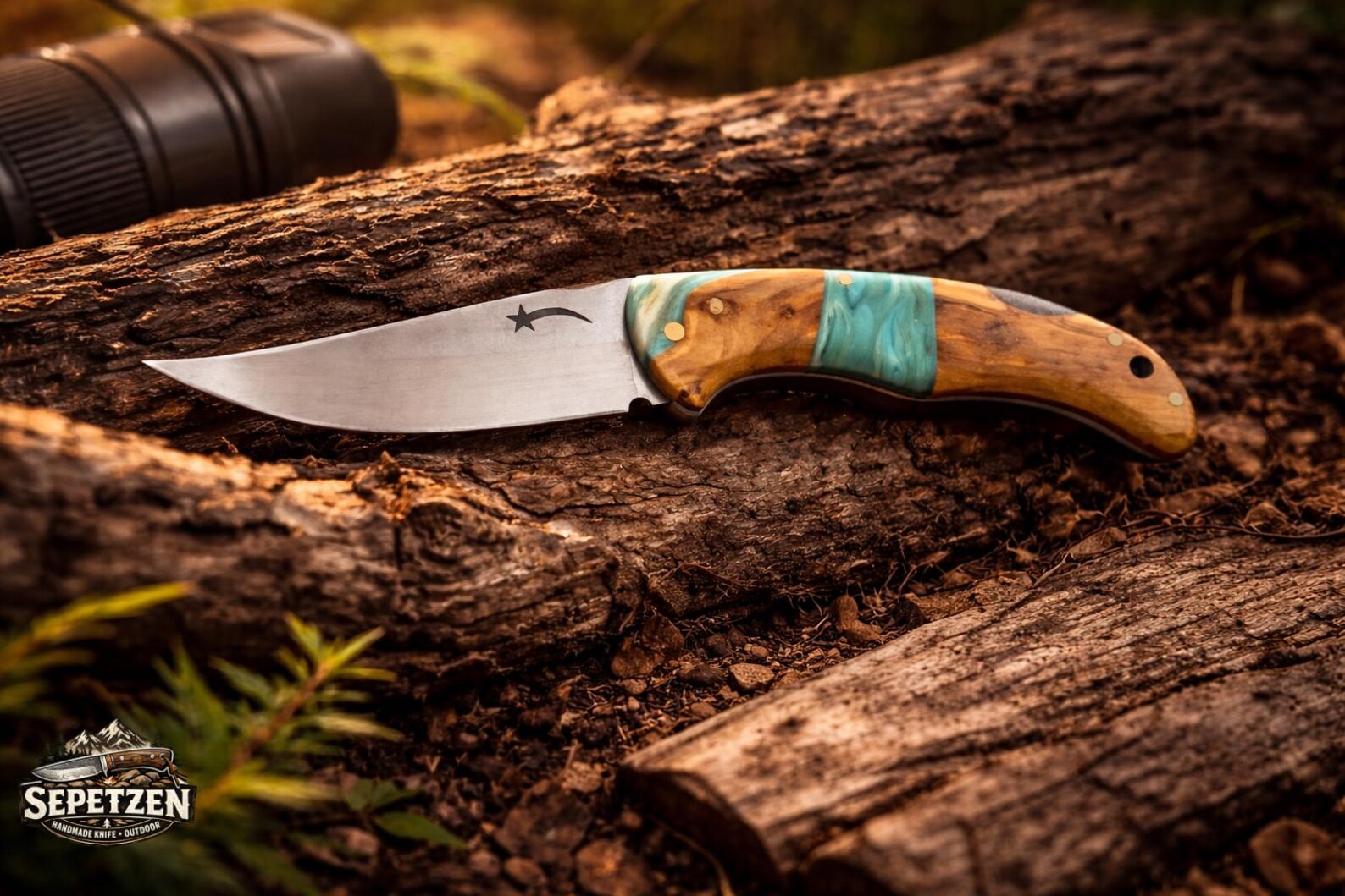 Oymalı Çelik Bıçaklı, Reçine Detaylı Sert Ağaç Saplı El Yapımı Katlanır Cep Bıçağı